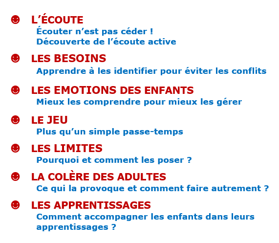 Inspiré par : les dernières recherches en neurosciences, les acquis de la psychologie positive, la communication non-violente, et ce que nous savons aujourd’hui sur les mécanismes émotionnels des enfants et des adultes.