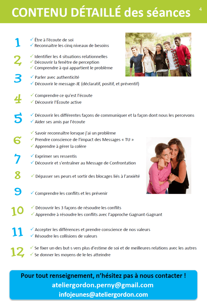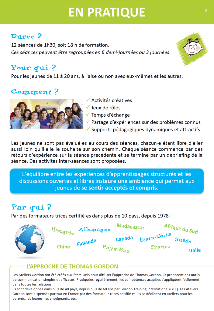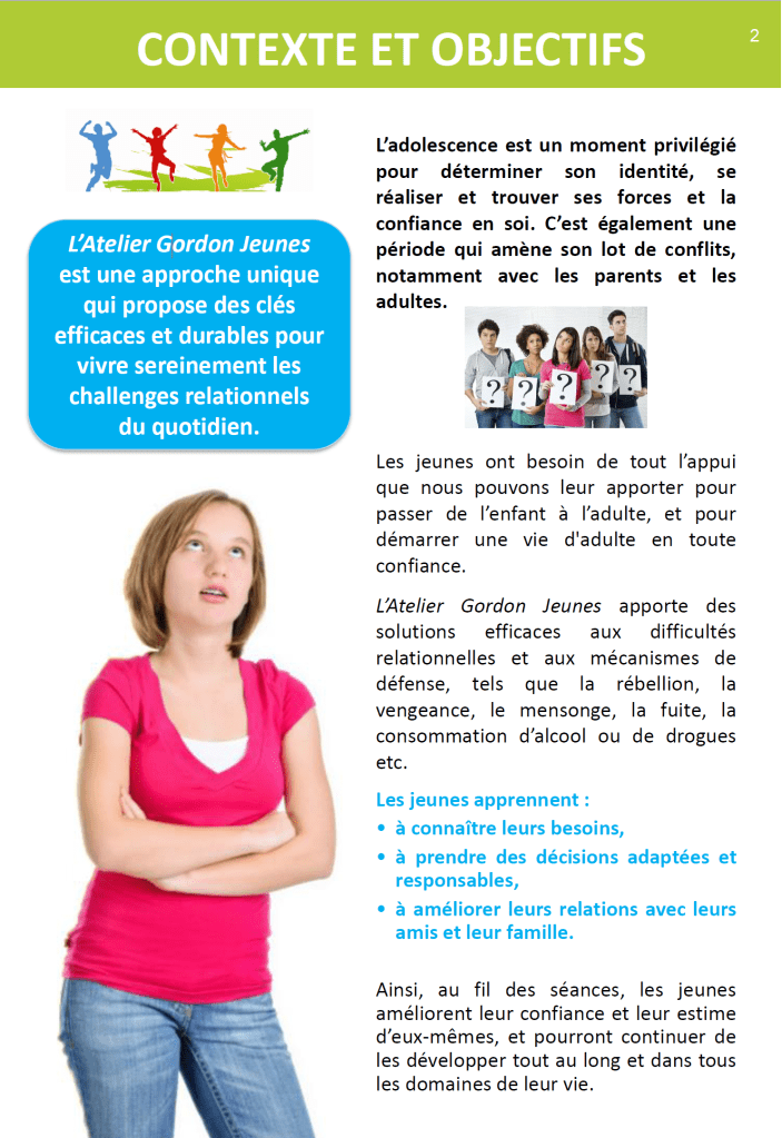 En s’appuyant sur des expériences réussies dans plus de 10 pays et depuis près de 40 ans, l’Atelier Gordon va permettre aux jeunes d’améliorer leur relationnel avec leurs pairs, leur famille et tous les adultes qui les entourent, en leur donnant confiance et estime d’eux-mêmes. En un mot, développer le mieux vivre ensemble