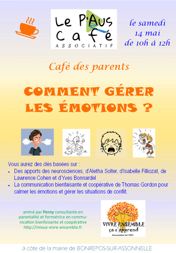 Voici le flyer pour le Café des parents sur la gestion des émotions, qui a lieu le samedi 10 mai matin au P’Aus Café, un café associatif à côté de la maire de Bonrepos-sur-Aussonnelle.