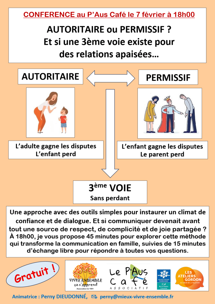 Nous aurons 45 minutes le 7 février à 18h00 pour examiner ces 3 styles et surtout explorer la 3ème voie qui est une méthode qui transforme la communication en famille, suivies de 15 minutes d’échange libre pour répondre à toutes vos questions.