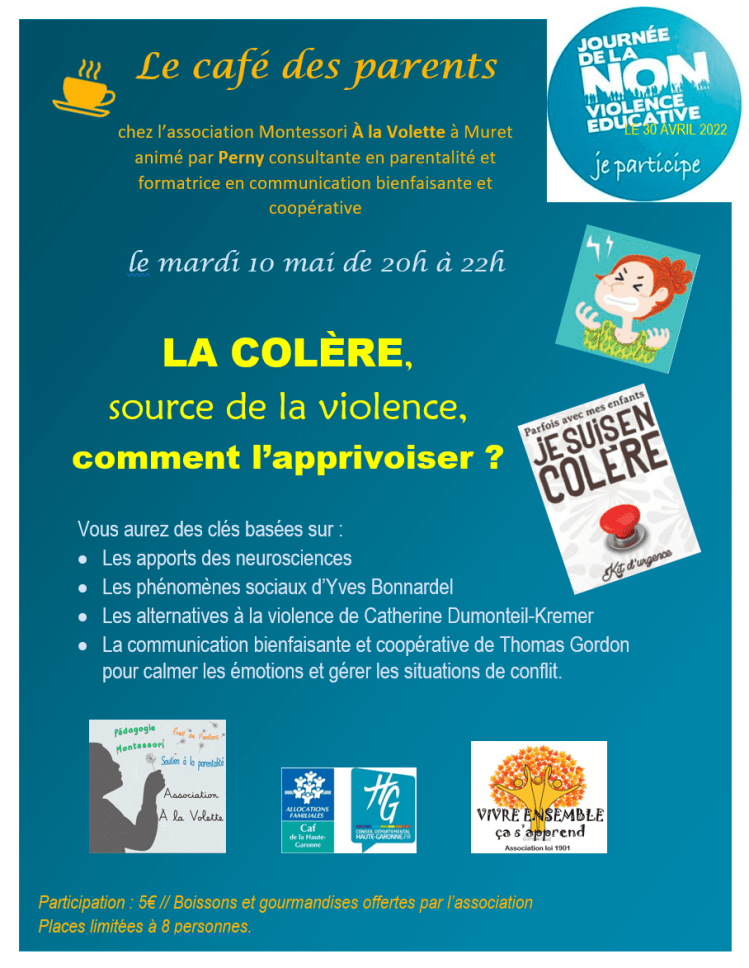 Voici le flyer et en dessous le lien pour s’inscrire au Café des parents chez l’association Montessori À la Volette à Muret le mardi 10 mai 2022 dans le cadre de la Journée de la Non-Violence Éducative.