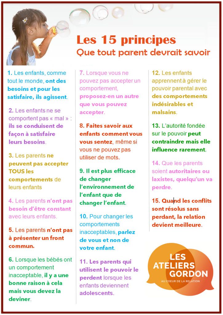 Voici les 15 principes de l’approche que Dr Thomas Gordon avait fait à la demande de la CCAS (Centre Communal d’Action Sociale) des États Unis.