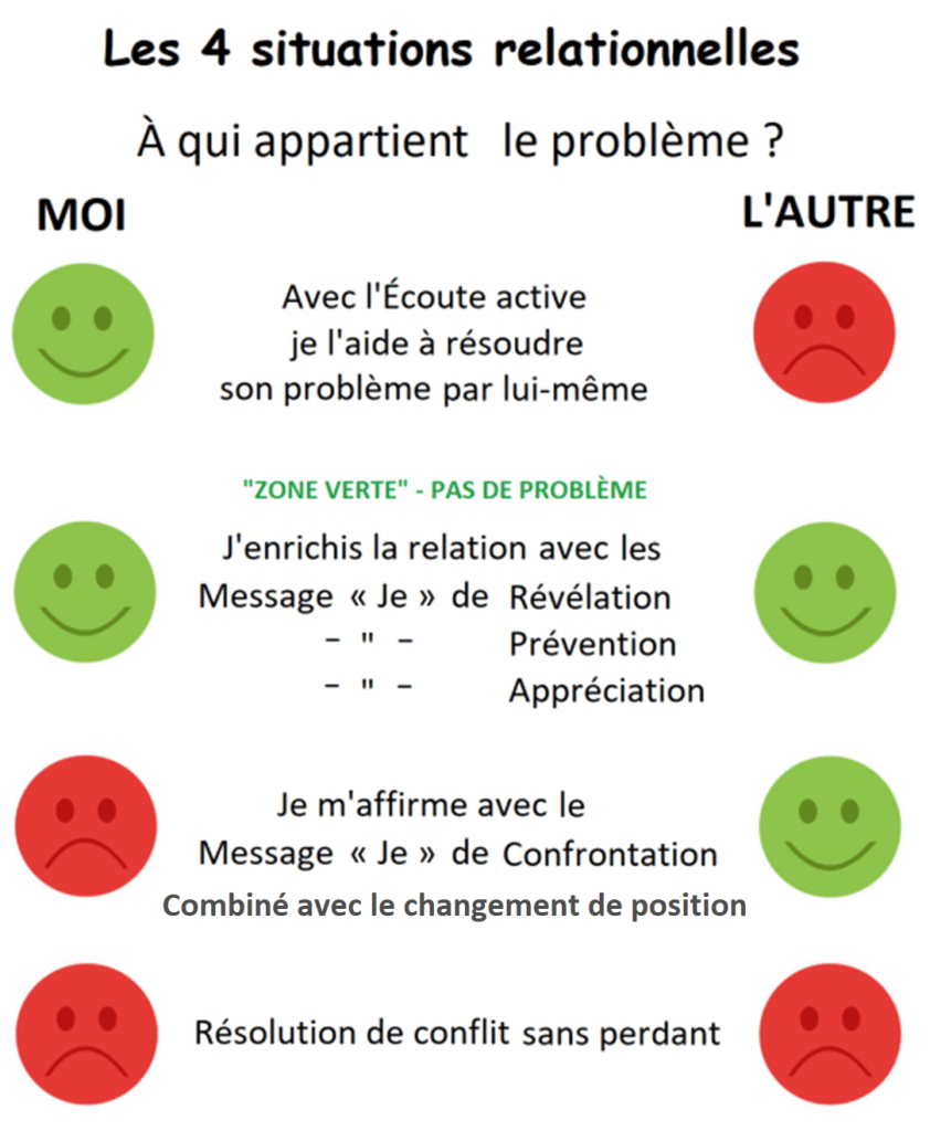 Pour identifier quel outil de communication utiliser dans quelle situation, le Dr Thomas Gordon a défini un cadre de 4 situations relationnelles pour identifier à qui appartient le problème. Cela parait simple, mais parfois nous avons une tendance à adosser un problème qui appartient à quelqu’un autre. Pour gérer le problème, qui appartient à quelqu’un autre, on utilise « l’Écoute Active ». Pour gérer un problème, qui appartient à nous, on utilise « le Message-Je de Confrontation ». Quand tout va bien, on essaie d’agrandir « la zone vert » avec les Messages-Je de Révélation, Prévention et d’Appréciation.